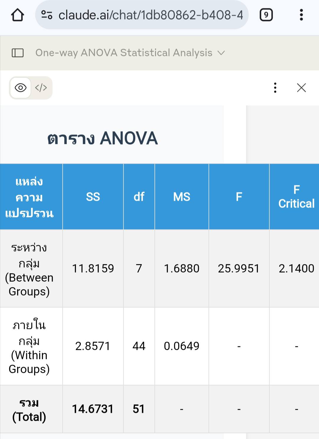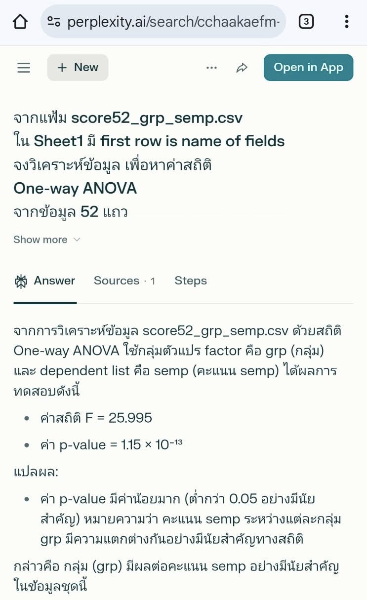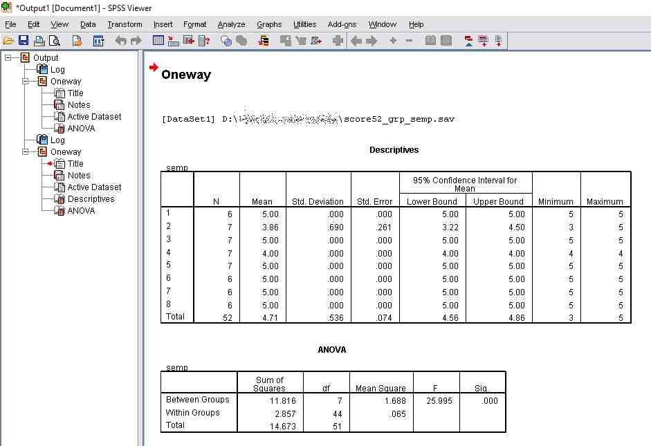 SPSS Data Editor Menu, File, Read Text Data ..., All Files (*.*) score52_grp_semp.csv Next, Delimited = checked, Variable names = checked, Next Next, Comma = checked, Next, Next, Finish Menu, File, Save as .. , score52_grp_semp.sav Menu, Analyze, Compare Means, One-Way ANOVA ..., - Dependent List = semp (ความพึงพอใจต่อเจ้าหน้าที่) - Factor = grp (เลขที่กลุ่ม) - Option, Descriptive = checked จะได้ตารางข้อมูลสรุป เช่น count, max, min OK --- Sig. = .000 F-Statistic = 25.995 --- GET DATA /TYPE=TXT /FILE='D:\thaiall.com\looker\score52_grp_semp.csv' /DELCASE=LINE /DELIMITERS="," /ARRANGEMENT=DELIMITED /FIRSTCASE=2 /IMPORTCASE=ALL /VARIABLES= sid F5.0 grp F1.0 sex A1 semp F1.0. CACHE. EXECUTE. DATASET NAME DataSet1 WINDOW=FRONT. SAVE OUTFILE='C:\score52_grp_semp.sav' /COMPRESSED.